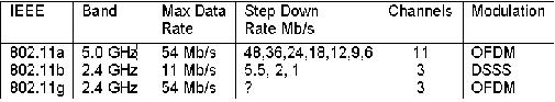 The IEEE 802 LAN/MAN Standards Committee has 4 groups working on standards for radio based systems; IEEE 802.11(WLAN), IEEE 802.15 (WPAN), IEEE 802.16 (WMAN) IEEE 802.20 (Wireless Mobile). Each will be addressed but we will focus most of our attention on IEEE 802.11 since it is currently in service and widely adopted. IEEE 802.11 The first proposal this subcommittee considered was the 802.11a which defined a physical transport layer and was based on Orthogonal Frequency Division Multiplex (OFDM) technology. Consequently, ratification of this proposal was delayed because of complexity in the OFDM technology and end user products based on this standard weren't seen until 2002. The second proposal 802.11b was based on Direct Sequence Spread Spectrum (DSSS) which is a relative simple technology and it was quickly ratified and end user products soon began to emerge 2 years earlier in 2000. This particular High-Frequency Wireless Local Area Network (WLAN) has also come to be known as Wireless Fidelity or Wi-Fi for short. [2] When this article was written, the latest proposal 802.11g was under consideration and was soon expected to be ratified. The following tables illustrate the key aspects of the 3 different 802.11 standards.
