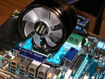 As a practical matter Corsair’s cable management allows a user to connect only the cables s/he really needs to wire the rig neatly (remember 2nd grade? well neatness still counts!). There are 12 HD and 12 SATA plugs enough for very well equipped file server. With the six 6+2 pin connectors you'll can power triple-SLI systems as wells as triple-Crossfire rigs. We recommend the Corsair HX850W without reservation to anyone who needs a stable system and a significant, efficient power source. Therefore it doesn't matter if you're a gamer or hardware-buff. The HX850W is stable and provides your rig with plenty of muscle. For more info and downloads go to: www.corsair.com. Zalman 9700NT CPU Cooler: Quiet air power.